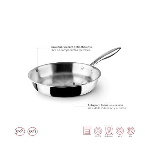 The IBILI Triply Natural Frying Pan is crafted with durable stainless steel and aluminum for efficient heat conductivity, perfect for healthier cooking. Its non-stick surface makes cleanup a breeze, while being suitable for all cookers, including induction.