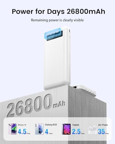 The 26800mAh Power Bank with Built-in Cables is an impressive portable charger designed for those who prioritize convenience and efficiency while on the go. With an enormous battery capacity of 26800mAh, this power bank can easily charge multiple devices without needing a recharge itself, making it a perfect travel companion. The built-in cables eliminate the hassle of carrying extra cords, and with a fast charging capability of 22.5W, your devices will be back to full power in no time.