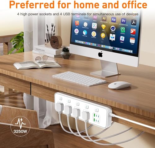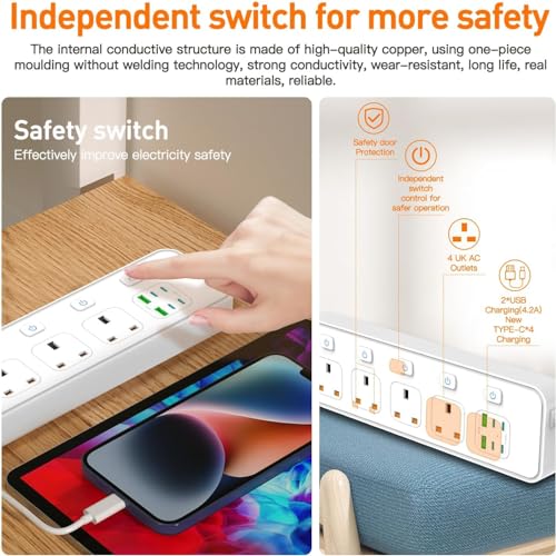 The AUNNO 4 Way Extension Lead with USB is an excellent choice for those in need of a reliable and versatile power solution. With its sleek white design, this extension lead blends seamlessly into any room while offering impressive functionality. It features four UK power outlets, allowing you to connect multiple devices simultaneously without any hassle. Additionally, the six USB ports, including four USB-C slots, provide ample charging options for modern gadgets, making it perfect for both home and office use.