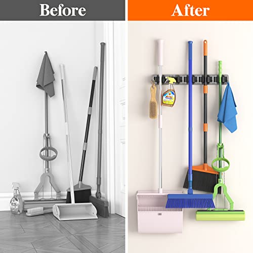 Heavy-Duty Wall-Mounted Broom Holder with 5 Slots & 6 Hooks