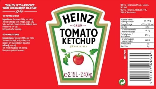 Heinz Tomato Ketchup 2 x 2.15 Litre Jars is a staple condiment that brings a burst of flavor to your meals. This classic ketchup is renowned for its rich and tangy taste, making it an ideal addition to burgers, fries, and other dishes. The generous 4.8 kg packaging ensures you have plenty of ketchup on hand for family gatherings, barbecues, or simply to satisfy your everyday cravings. With dimensions of 20.2 x 14.1 x 24 cm, these jars are easy to store in your kitchen pantry or refrigerator. The product comes in a convenient jar format, allowing for easy dispensing while ensuring freshness. Once opened, remember to refrigerate to maintain flavor and quality. Heinz Tomato Ketchup is not only a delicious accompaniment but also enhances a wide variety of cuisines, especially European.