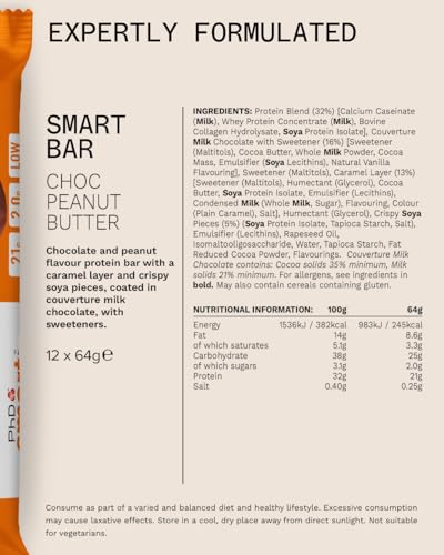 PhD Smart Protein Bars in Chocolate Peanut Butter flavor present a delectable option for those seeking a nutritious snack that fits into a busy lifestyle. Each bar is designed to be a high-protein treat, delivering an impressive 21 grams of protein while keeping sugar to a minimum at just 2 grams per bar. This makes them an exceptional choice for fitness enthusiasts and health-conscious individuals alike. The bars are conveniently packaged, making them easy to take on-the-go, whether you’re heading to the gym or just need a quick snack at work.