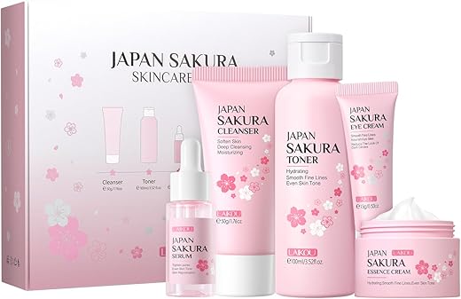 Experience radiant skin with this comprehensive skincare set featuring a cleanser, toner, serum, eye cream, and face cream, all enriched with cherry blossom extract. Perfect for all skin types, it hydrates and revitalizes while making an ideal gift for loved ones.