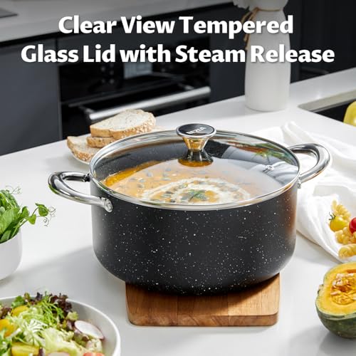 The tempered glass lid allows you to monitor your cooking without losing heat, while the stainless steel handles are ergonomically designed for a secure grip. Compatible with induction cooktops, this stock pot is ideal for modern kitchens and diverse cooking methods. Its sleek black finish adds a touch of elegance to any cookware collection.
