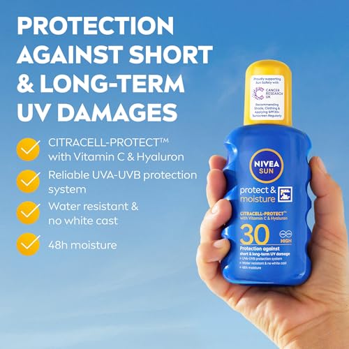 NIVEA SUN Protect & Moisture Spray SPF 30 is an exceptional sunscreen that provides immediate protection against harmful UVA and UVB rays while ensuring your skin remains hydrated for up to 48 hours. This innovative spray formula absorbs quickly, making it ideal for those on the go. One of the standout features of this product is its non-greasy finish that leaves no white cast, making it suitable for all skin types. Infused with the soothing scent of Aloe Vera, it promises a refreshing application experience.