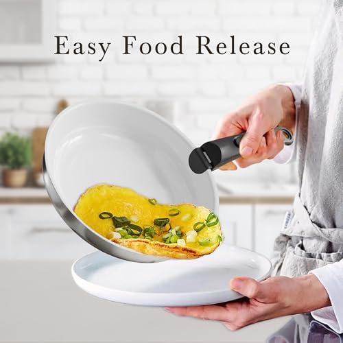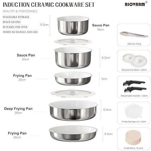 Discover the RIOVARM Stainless Steel Frying Pan and Pot Set, designed for all cooking surfaces with a ceramic non-stick coating for easy cleaning. Enjoy stackable, space-saving design and removable handles for a stylish kitchen experience.